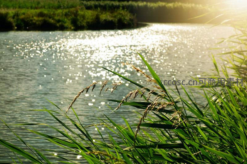 微距镜头下,翠绿芦苇随风轻摆,背景是波光粼粼的湖面,金色阳光穿透叶片,在水面上投下点点光斑,营造出宁静而梦幻的氛围。