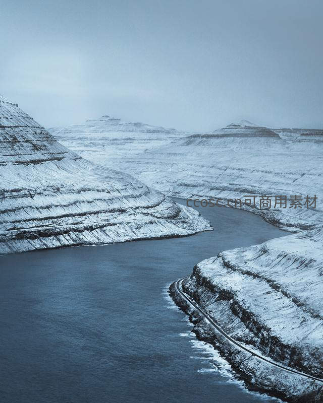 白雪覆盖的陡峭峡谷中,一条深色河流静静流淌,两岸岩层清晰可见,天空阴沉,整个画面透出一种苍凉而壮阔的极地美感。