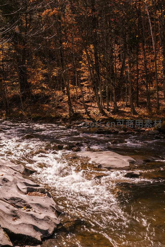 温暖阳光斜照入幽深林间,溪水在嶙峋石块上奔涌跳跃,溅起晶莹水花,光影交错中展现大自然原始而充满活力的韵律。