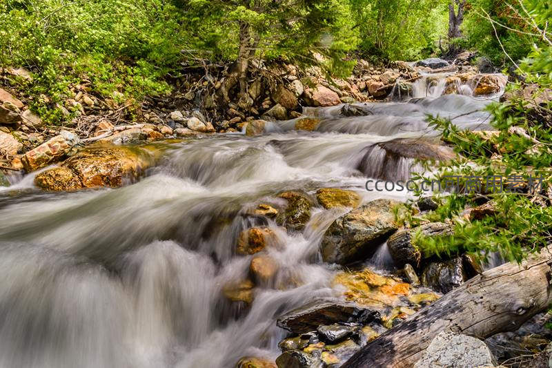清澈的溪水在布满苔藓和卵石的山谷中奔腾而下,水流因长曝光呈现出丝滑质感,四周绿树环绕,生机勃勃,是大自然充满活力与纯净的写照。