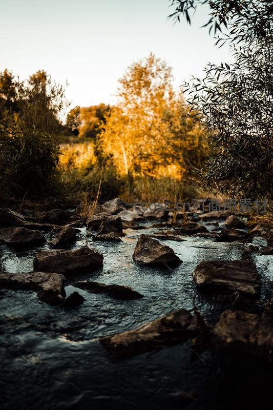 温暖的夕阳光线穿透树叶,洒落在清澈的溪流和散布的岩石上,水面波光粼粼,营造出静谧而治愈的黄昏景象。