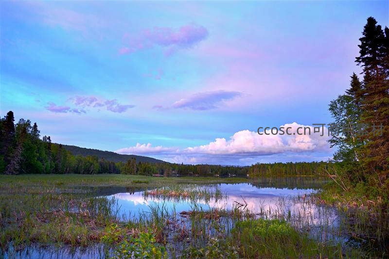 黄昏时分湖面平静如镜,将粉紫渐变的天空与蓬松云朵完美倒映,四周芦苇轻摇,远山朦胧,营造出梦幻柔和、令人沉醉的自然暮景。