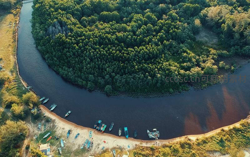 从高空俯瞰,蜿蜒河流如丝带般环抱着郁郁葱葱的森林半岛,河岸沙地上整齐排列着多艘小船,展现出人与自然和谐共存的生态画面。