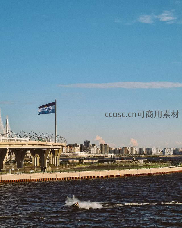 在晴朗的蓝天下,一名骑手驾驶摩托艇在宽阔的河面上飞驰,激起白色浪花。远处是现代化的城市建筑群,近处有高架桥和飘扬的旗帜,构成一幅动感与宁静交融的城市水景图。