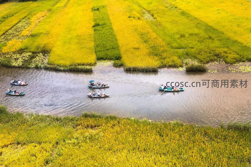 航拍金黄稻田河道,游人乘船穿行如画田园间