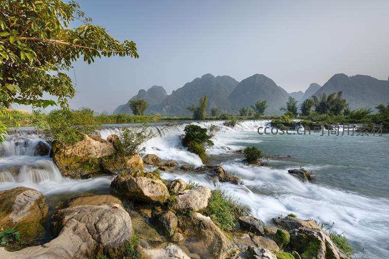 层叠瀑布从岩石上倾泻而下,水流如绸缎般柔滑,背景是典型的喀斯特山峰,蓝天白云下尽显大自然鬼斧神工的壮丽画卷。