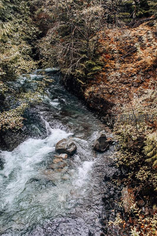 溪水在布满苔藓与落叶的山谷中奔腾跳跃,阳光透过树冠洒落斑驳光影,两岸植被渐染秋色,呈现原始而生动的自然韵律。