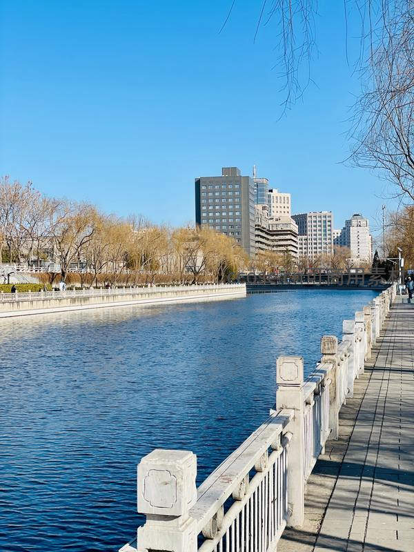 晴朗蓝天下,城市河畔的石栏步道蜿蜒延伸,两岸绿树与现代建筑相映成趣,行人悠闲漫步,尽显都市中的自然宁静。