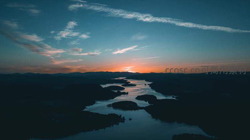高空俯瞰下,夕阳余晖染红天际,蜿蜒湖泊如镜面倒映霞光,群山轮廓在暮色中静默,构成一幅壮丽而安详的自然画卷。