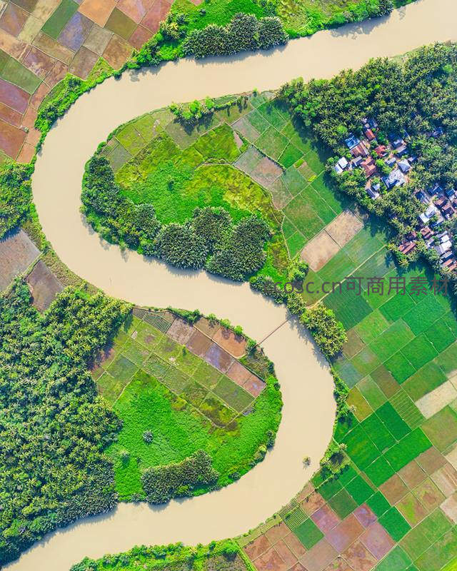 S形河流航拍,农田如拼布般镶嵌于水道两侧