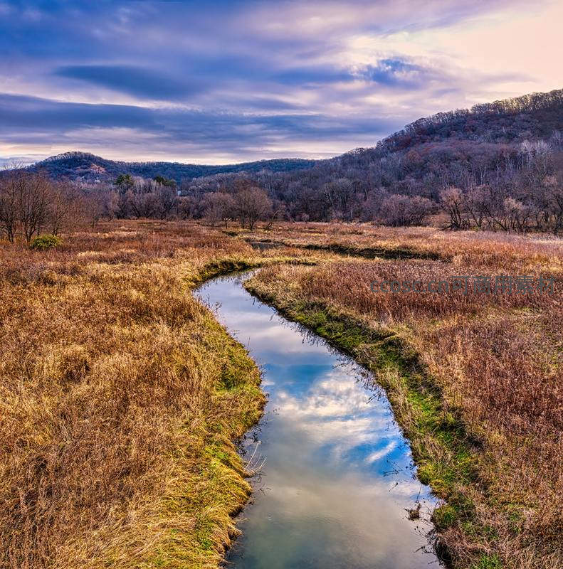 一条清澈小溪在枯黄草甸中曲折流淌,水面平静如镜,完美倒映着多云的天空和远处连绵山丘,呈现出大地的柔美曲线与季节的静谧感。