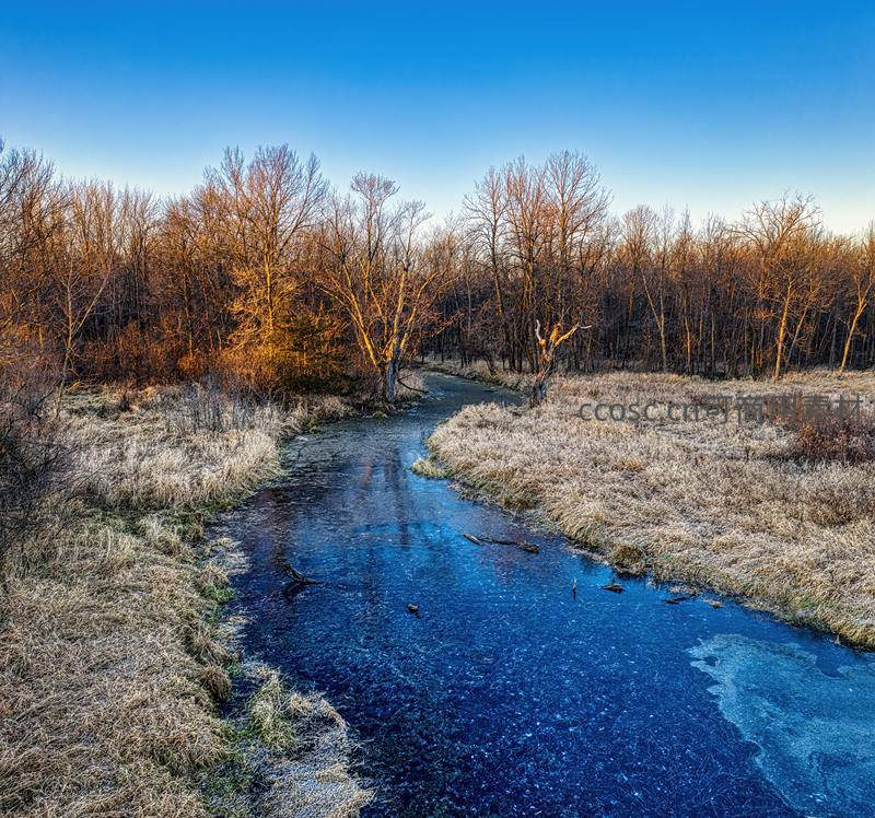 寒冬时节,溪水部分冻结,冰面反射着温暖的夕阳光芒,两岸枯草覆盖,光秃树木静立,构成一幅冷暖交织、宁静致远的冬日画卷。