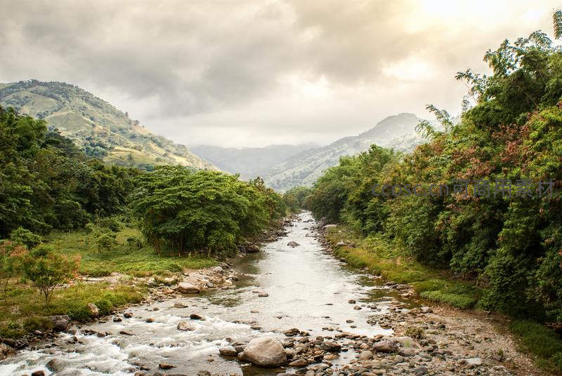 清澈的溪水在青翠山林间蜿蜒流淌,两岸绿树成荫,远处山峦叠嶂,云雾轻笼,营造出宁静致远的自然意境。