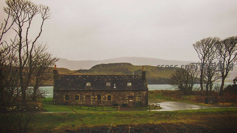 一座古老的石砌房屋坐落在湖边,背景是连绵的山丘和光秃的树木,营造出一种宁静而略带忧郁的乡村氛围。