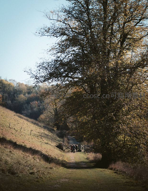 一条蜿蜒的乡间小路穿过金黄落叶覆盖的树林,几人正沿着小径走向远处的木栅栏门,阳光穿透枝叶洒下斑驳光影,充满了秋日午后宁静惬意的田园气息。