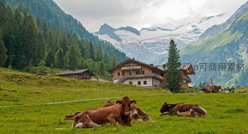 在白雪皑皑的雄伟山脉和苍翠松林的环抱中,几头奶牛在绿茵茵的草地上休憩,远处的木屋点缀着这片宁静的阿尔卑斯风光。