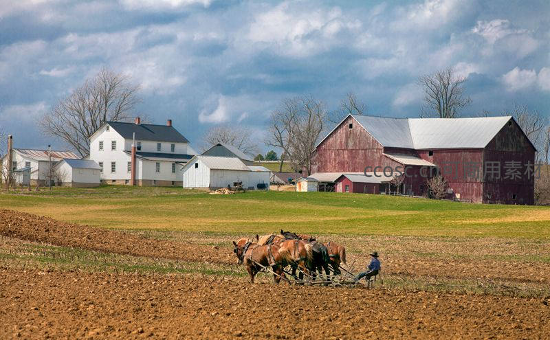 农夫驾驭着健壮马匹在广袤田野中辛勤耕作,身后是红白相间的古老谷仓和农舍,蓝天白云下勾勒出一幅充满生机的乡村劳动图景。