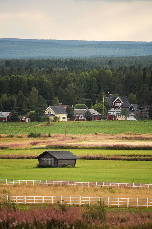 翠绿田野与茂密森林环抱宁静村落,红顶木屋错落有致,前景白色栅栏与野花点缀,远山如黛,构成一幅恬淡优美的北欧乡村风景。