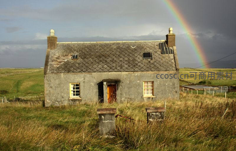一座孤寂的石屋静立在草野之中,身后一道绚丽彩虹横跨阴云密布的天空,营造出荒凉与希望交织的独特意境。