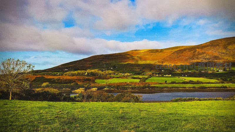 阳光洒在起伏的绿色山丘上,远处村庄静卧,近处湖水倒映蓝天白云,构成一幅宁静祥和的田园诗画。