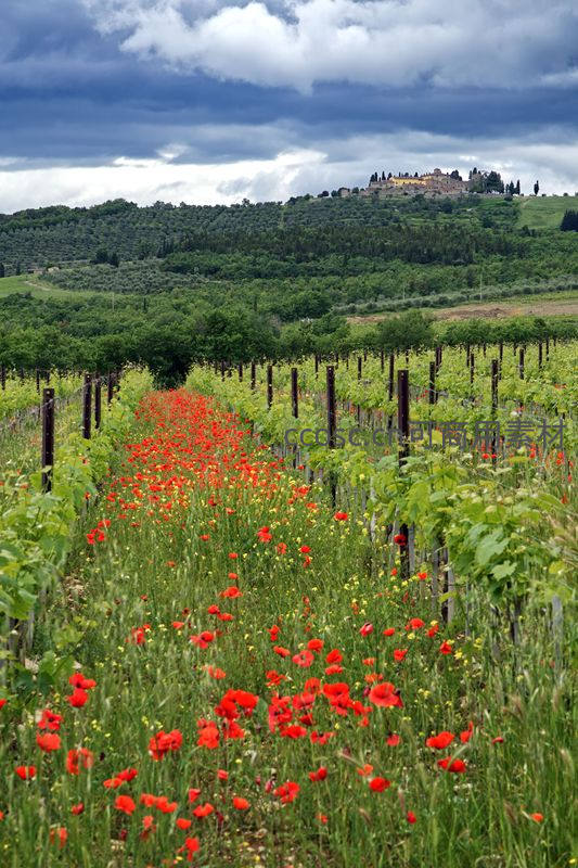 成排的葡萄藤间盛开着鲜艳的红色罂粟花,小径蜿蜒向前,远处山顶上的古老城堡在厚重云层下若隐若现。