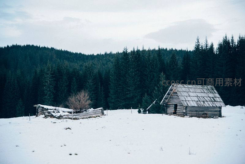 皑皑白雪覆盖着广袤山野,一座简陋的木屋孤零零地伫立在松林前,四周一片寂静,尽显冬日的苍茫与清冷。