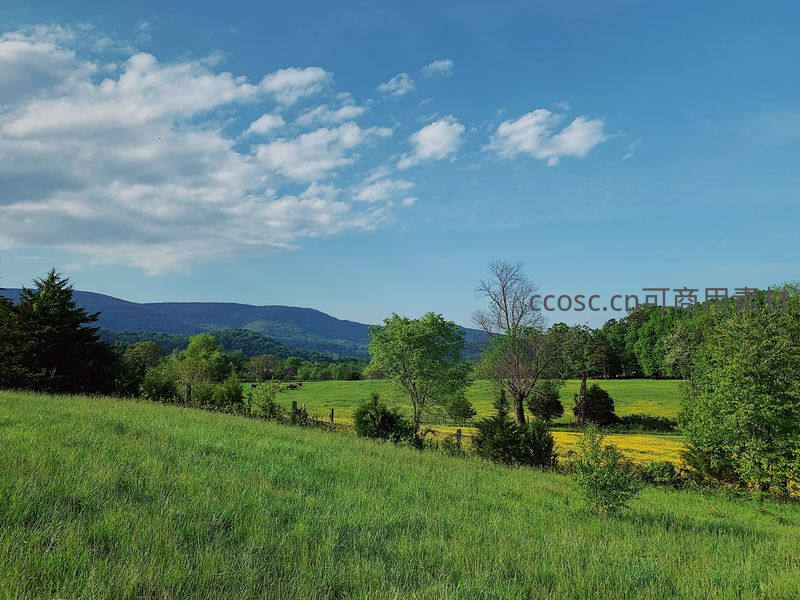 蓝天白云下绿野无垠,远山如黛景致怡人