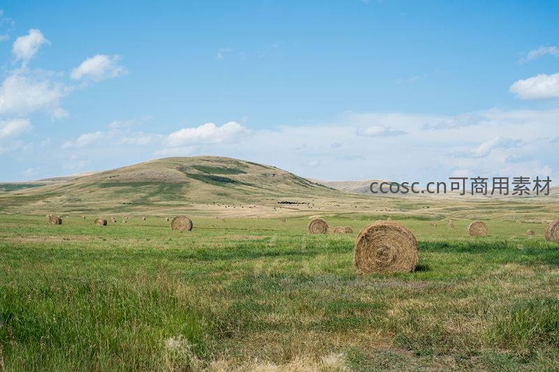 辽阔草原上散落着圆形干草捆,远处缓坡连绵,天空湛蓝,展现出一派宁静而丰饶的牧区景象。