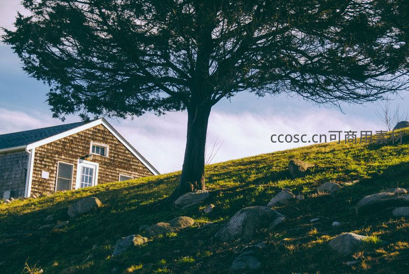 一座质朴的木瓦屋坐落在青翠的斜坡上,一棵枝繁叶茂的大树在旁边投下浓密的阴影,阳光洒在草地上,营造出静谧的田园氛围。