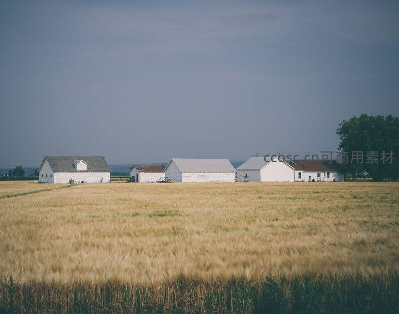 一望无际的金色麦田在微风中起伏,几座洁白的农舍静静伫立其中,构成一幅宁静而富有诗意的乡村丰收景象。