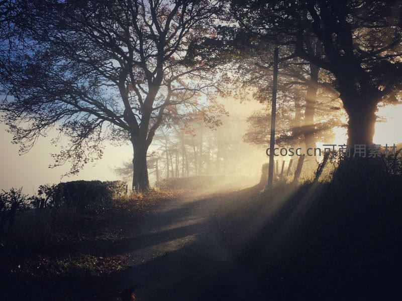 清晨薄雾弥漫在乡间小路上,高大的树木枝干交错,金色的阳光穿过树叶缝隙,在地面投下斑驳光束,营造出如梦似幻的静谧氛围。
