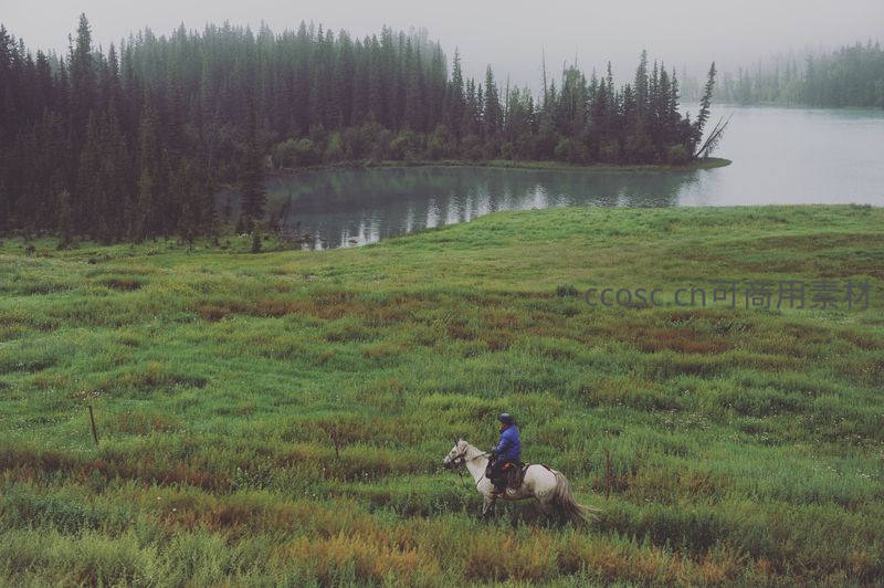 一人一马悠然行于青翠草原,背景是薄雾笼罩的茂密森林与平静湖面,构成一幅宁静致远的自然画卷。
