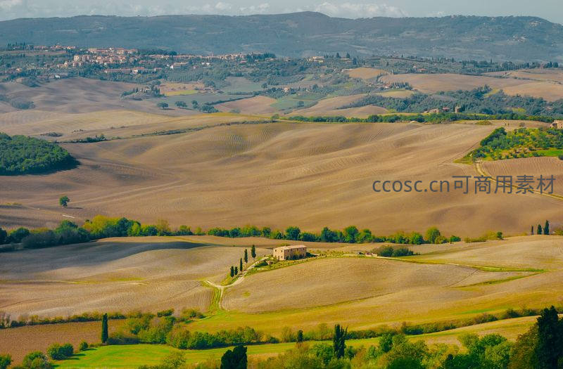 阳光洒在连绵起伏的金色丘陵上,点缀着绿树和古朴农舍,远处山峦叠嶂,尽显托斯卡纳乡村的浪漫与宁静。