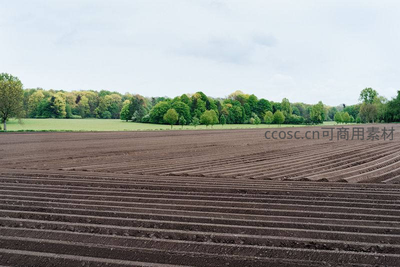 深褐色的耕地被犁出整齐平行的沟壑,延伸至远方绿意盎然的树林边缘,天空阴云密布,预示着即将到来的播种季节。