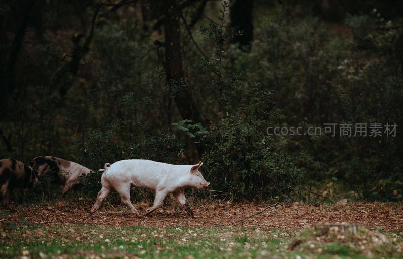 几只小猪在林间落叶覆盖的小径上欢快奔跑,周围是茂密的树木和斑驳光影,展现出生机勃勃的乡村生态景象。
