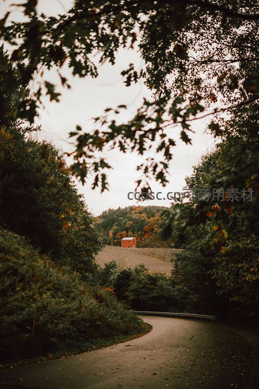 透过枝叶间隙,一条弯曲小路延伸向远方山坡上的红色小屋,四周秋色斑斓,营造出诗意而宁静的秋日氛围。