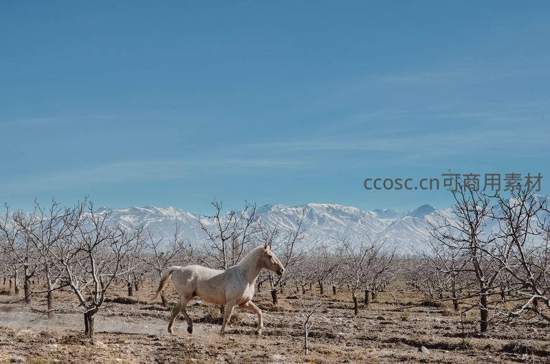 一匹白马在光秃的果园中奔跑,背景是连绵的雪山和湛蓝天空,大地干涸,枝桠交错,构成一幅冷峻而富有动感的冬日画卷。