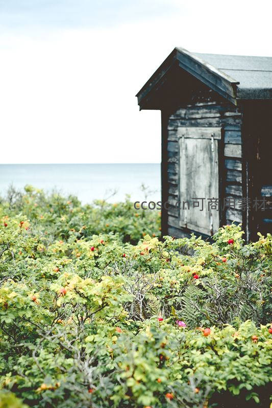 一座老旧木屋静立于海边灌木丛中,枝头挂满红色浆果,远处海天一色,微风轻拂,营造出远离尘嚣、质朴自然的滨海生活氛围。