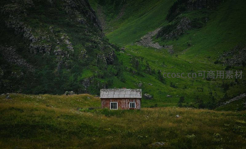 一座红色木屋静立于翠绿山谷之中,四周被陡峭山壁与茂盛植被环绕,营造出远离尘嚣的宁静氛围。