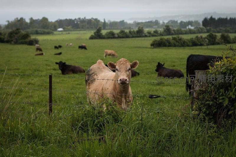 一头浅棕色奶牛站在铁丝网前,好奇地注视着镜头,背景是广阔的绿色牧场和悠闲吃草的牛群。