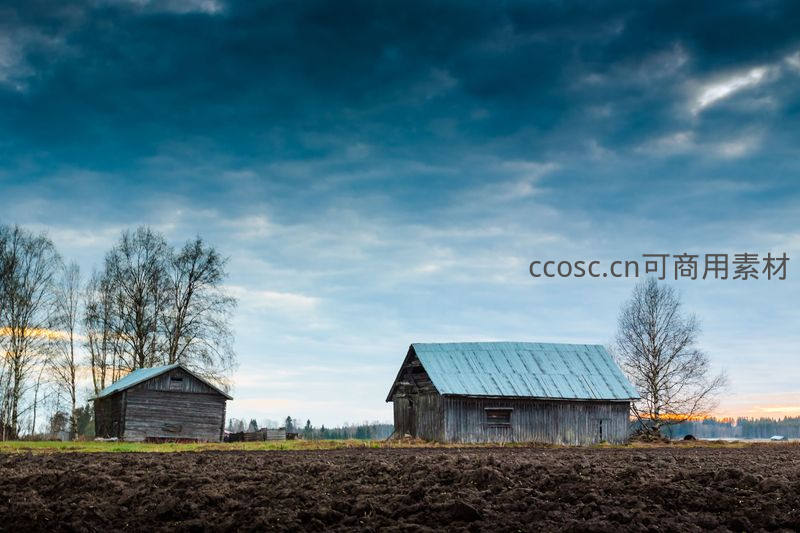 两座老旧木屋静立在刚翻耕的黑土地上,背景是戏剧性的深蓝色乌云与微露的夕照,营造出一种宁静又略带苍凉的乡村暮色景象。