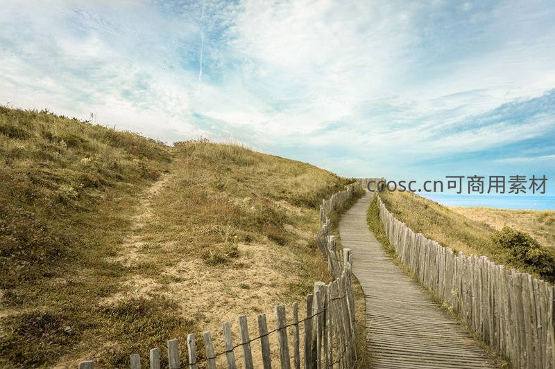 一条木质栈道穿过覆盖着绿草和枯黄植被的沙丘,延伸至远方的蔚蓝大海,天空中飘着几缕白云,营造出宁静而开阔的海滨氛围。