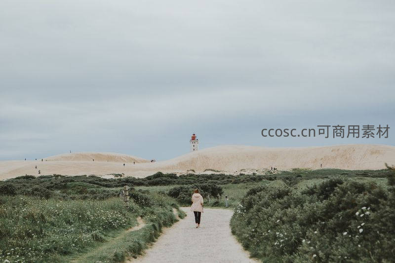 一人独行于沙丘小径远眺灯塔的背影