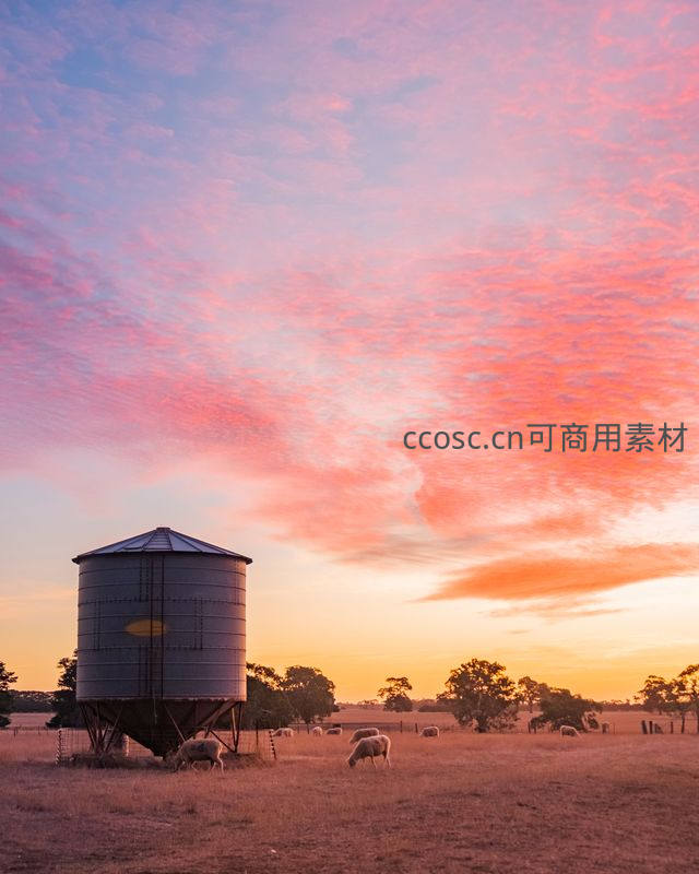 绚烂的粉橙色晚霞铺满天空,巨大的金属水塔矗立在干草地上,几只绵羊悠闲地低头觅食,画面充满宁静与诗意。