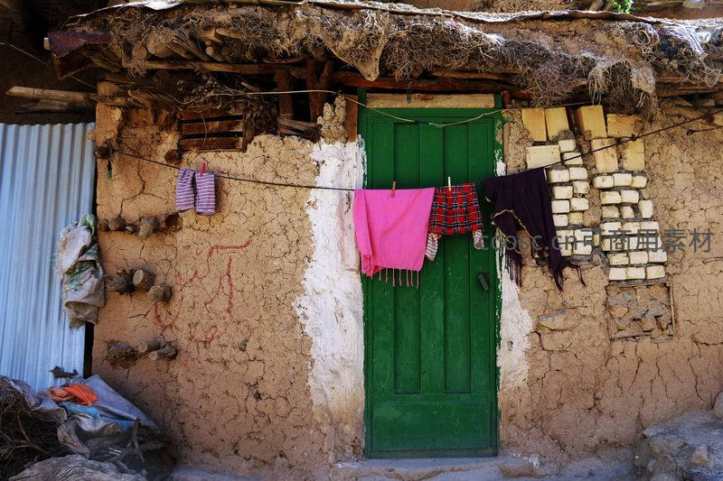 一座泥土砌成的房屋,绿色木门紧闭,门前绳索上晾晒着彩色衣物,墙面斑驳,充满浓郁的乡村生活气息和岁月痕迹。