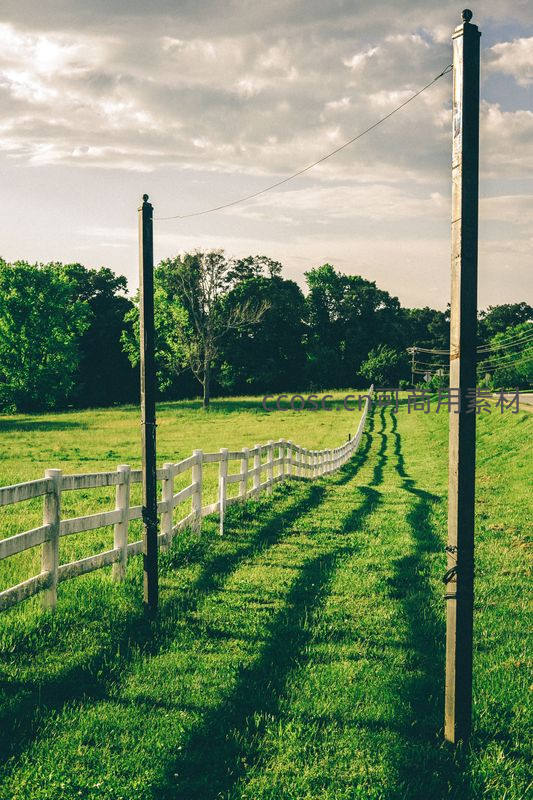 一道白色木栅栏沿着翠绿草坪蜿蜒伸展,阳光透过云层投下长长的影子,与栅栏交织成富有韵律的画面,尽显田园生活的恬静之美。
