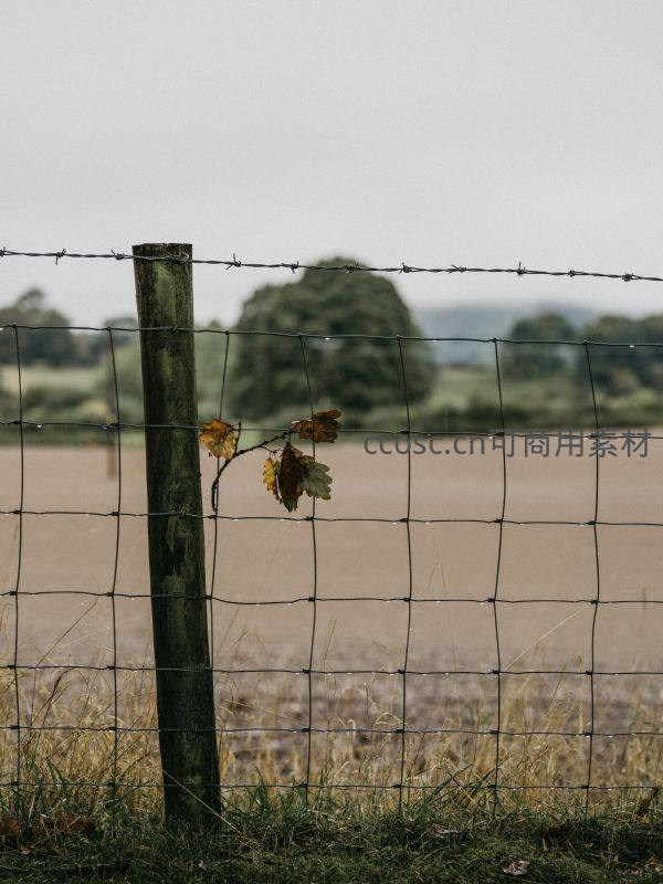 铁丝网围栏前枯叶轻挂,远眺朦胧田野