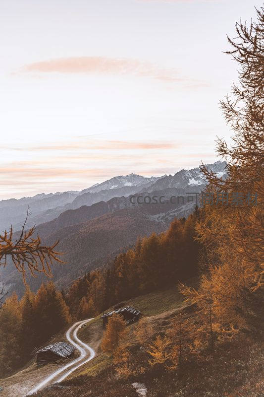 蜿蜒山路穿梭于金色落叶松林间,远处连绵山脉披上薄雪,天边晚霞晕染,构成一幅壮丽而温暖的高山秋日图景。