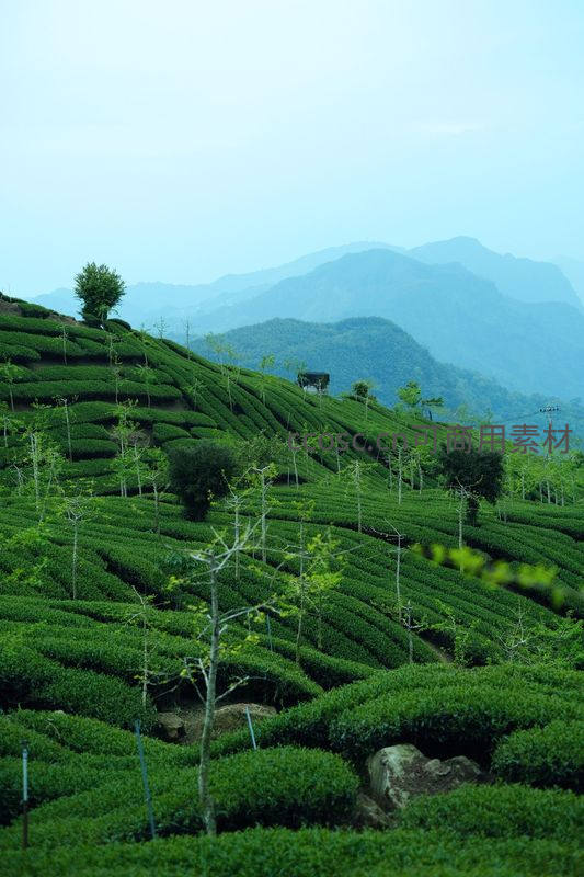 层层叠叠的翠绿茶园依山而建,薄雾轻笼远山,新芽初绽,展现生态农业之美与大自然的和谐共生景象。