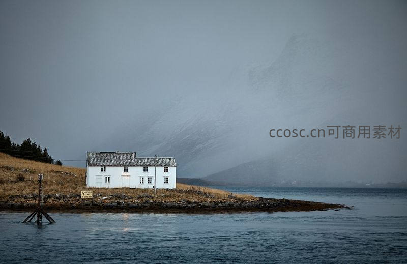 一座白色小屋静立于水边孤岛,背景是被浓雾笼罩的巍峨山脉,水面倒映着天光,营造出空灵而寂寥的北欧风情。